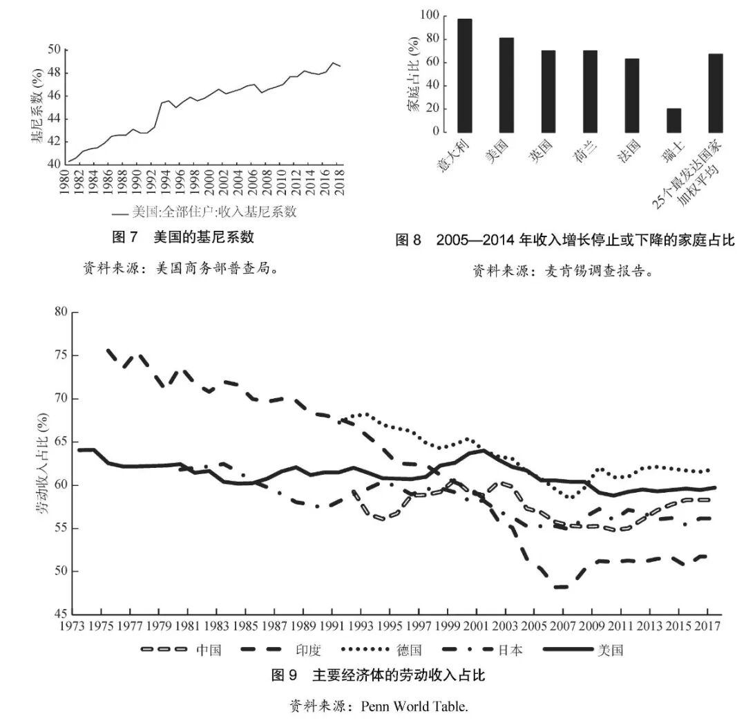 此外,贸易会促进偏向资本的技术变化,同时全球化会降低资本要素的相对价格,促进资本替代劳动。这些都会导致劳动收入份额的下降。有证据表明,自20世纪80年代全球化加速以来,高收入阶层的收入和财富份额不断上升。当然,除了全球化,劳动收入占比的下降还与要素替代弹性、偏向性技术进步、产业结构升级等有关。比如,中国的资本劳动替代弹性大于1,并不断上升,进而导致了中国的劳动占比下降。