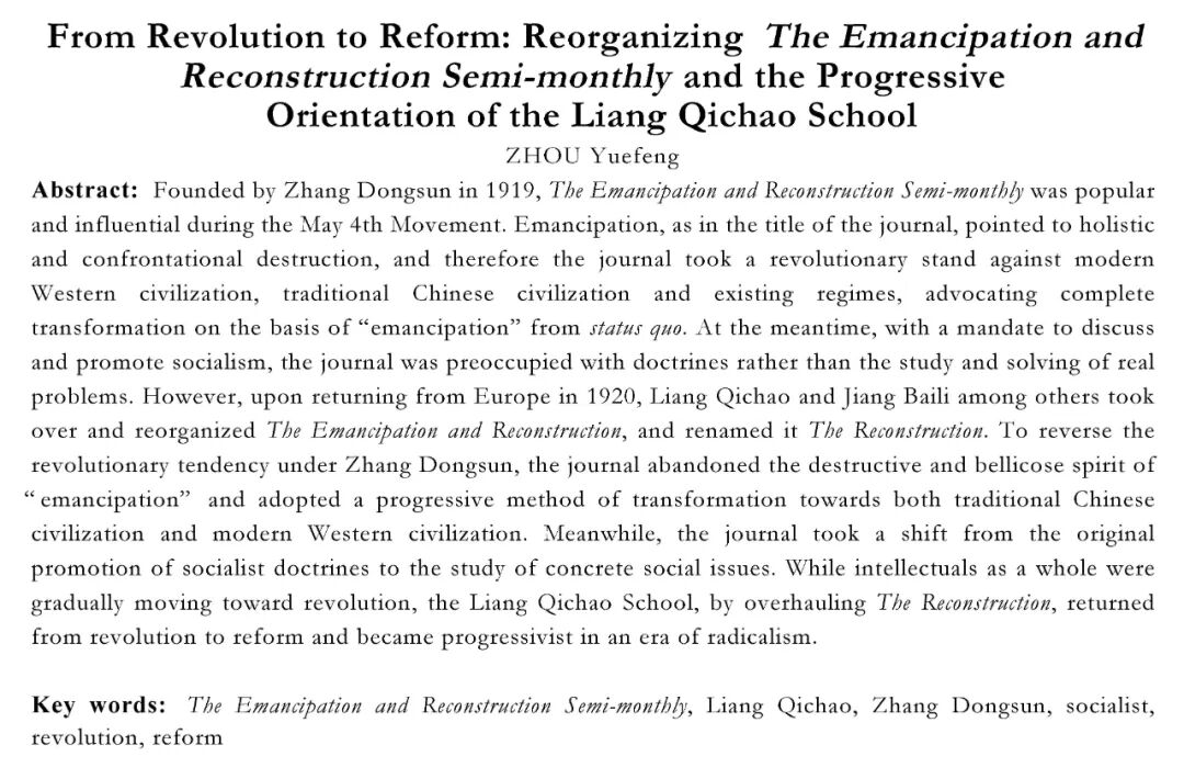 关键词:《解放与改造》;梁启超;张东荪;社会主义;革命;渐进改良