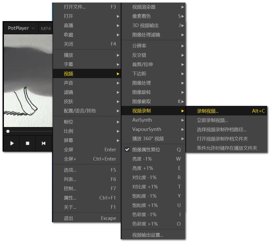 先暂停视频,然后在视频窗口右键——视频——视频录制——录制视频