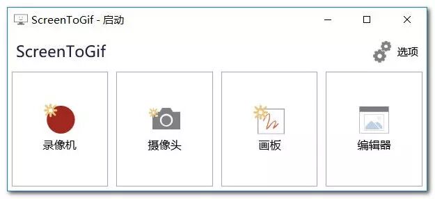 ScreenToGif默认启动界面如下,包含屏幕录像机、开启电脑摄像头录制、白板录制、GIF编辑器4个功能: