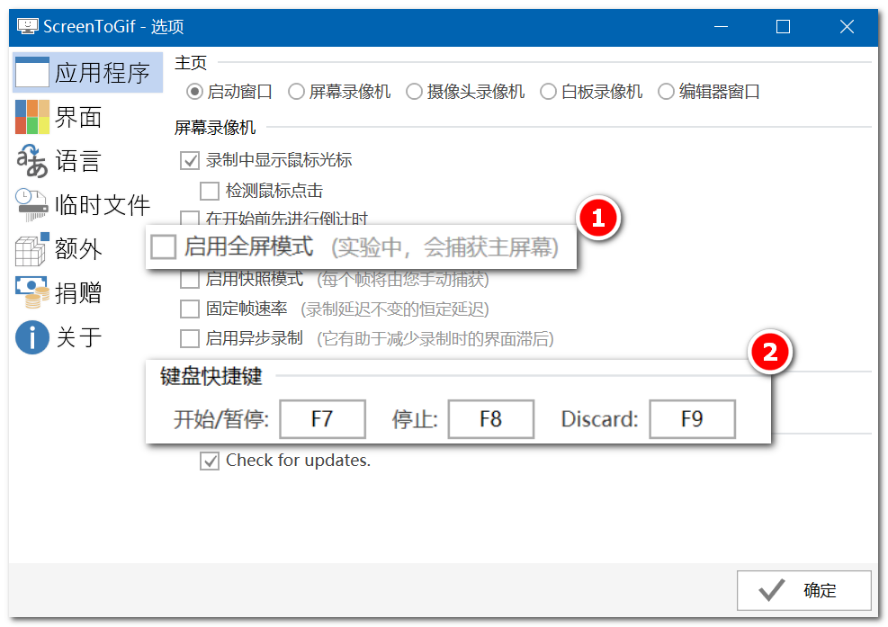 如果你想全屏录制,点击吸附窗口旁边的齿轮,打开「选项」,即可开启全屏录制功能。同时你可以自定义开始和结束录制的快捷键。