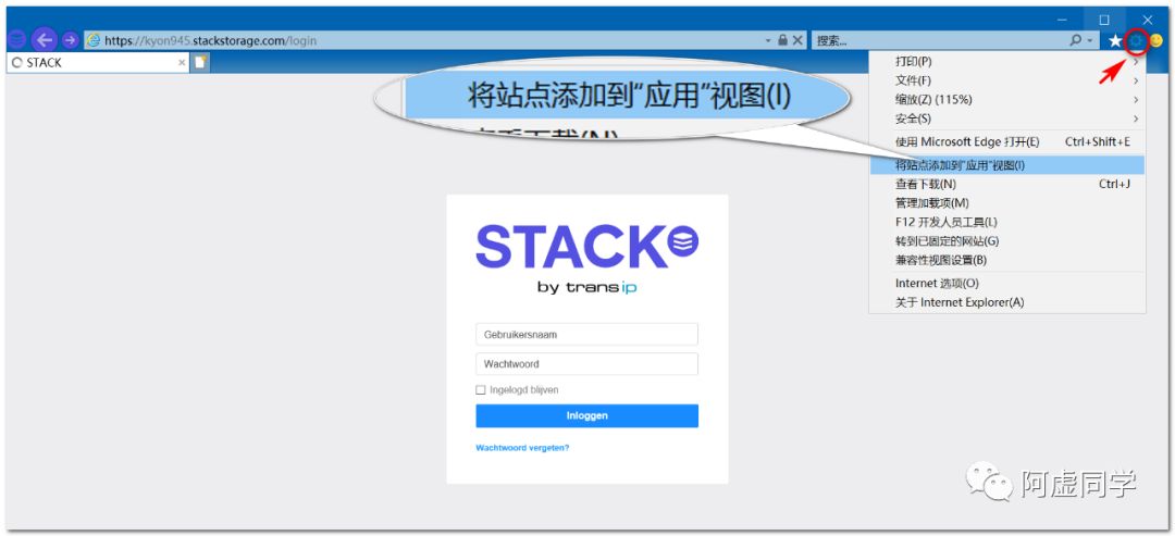 用IE浏览器,打开某一网站,点击右上方的小齿轮,可以选择将站点添加到“应用”视图