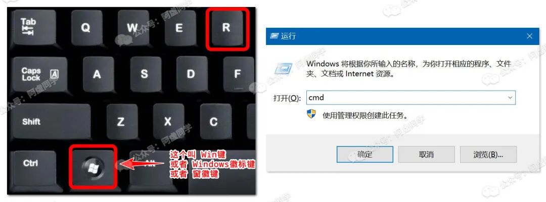 键盘点击「Windows 徽标键+R」弹出运行命令,输入「cmd」打开命令提示符