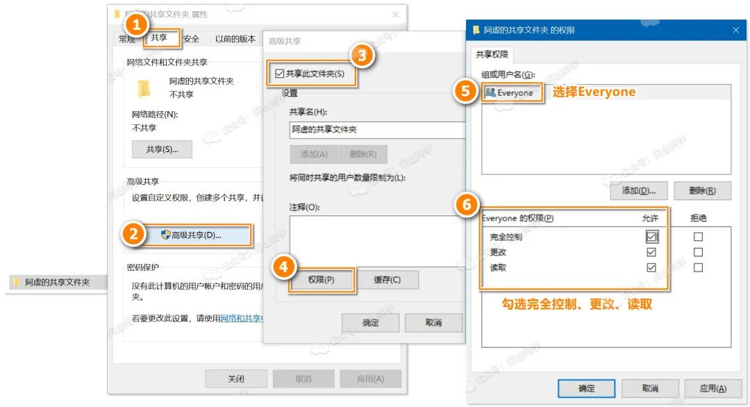 为了让iPhone也能传文件到电脑上,还需按下图步骤,添加用户「Everyone」并给其「读取/写入」权限