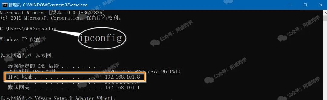 在命令提示符里面输入「ipconfig」然后回车,记下当前网卡的 IPv4 地址: