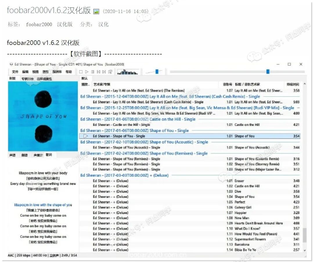 这里推荐给大家用的转码工具是 Foobar2000(后文要介绍的给音乐文件加歌词也要用到)