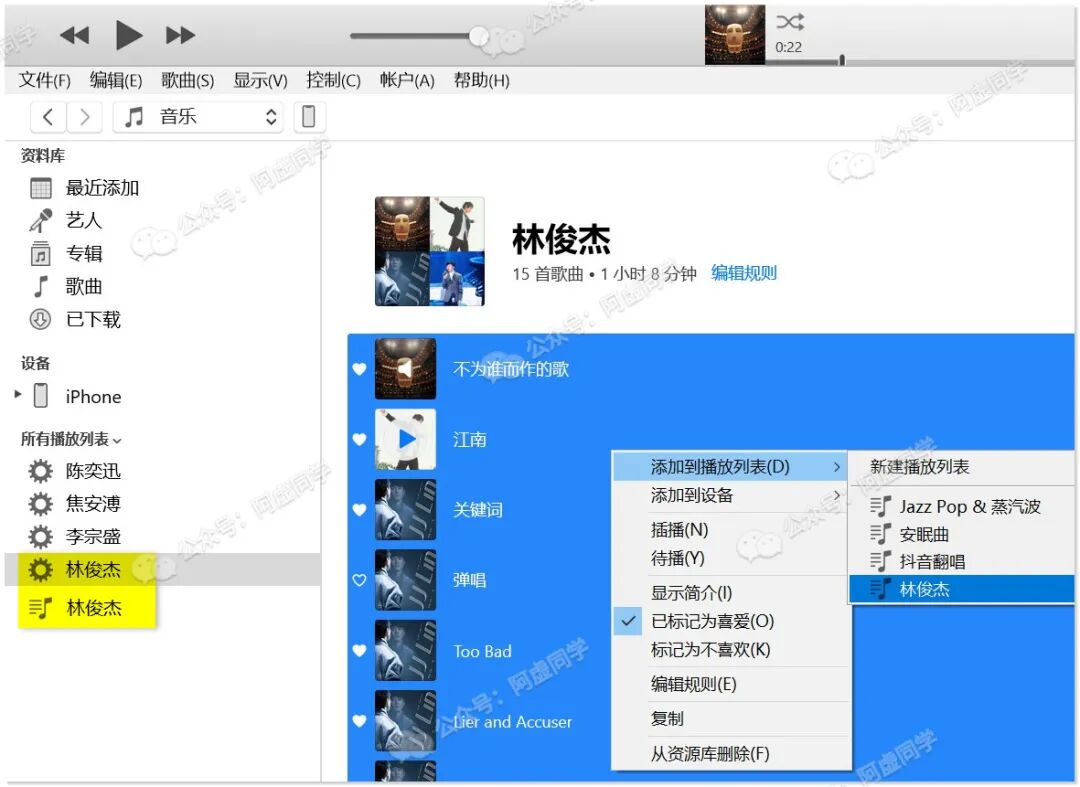 比如我给林俊杰这个智能播放列表,这样设置