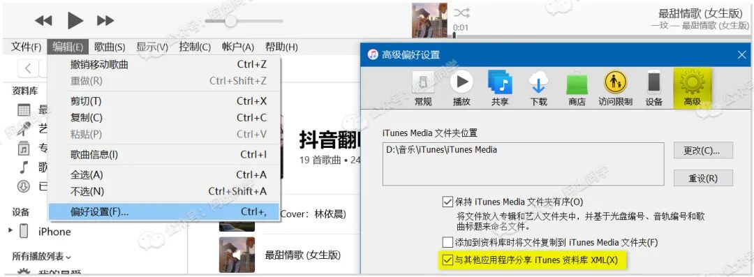 首先很关键的一步,在 iTunes 编辑 » 偏好设置 » 高级里面,勾选「与其他应用程序分享 iTunes 资料库 XML」