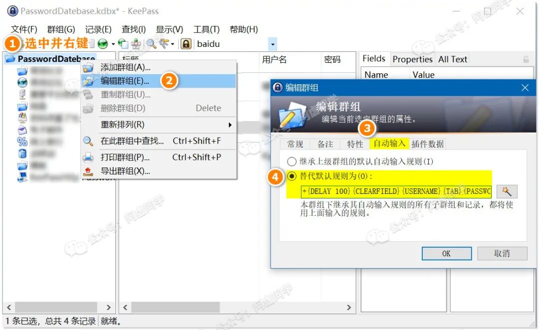 在KeePass主页面选中你的数据库并右键 » 编辑群组 » 自动输入 » 替代默认规则为:+{DELAY 100}{CLEARFIELD}{USERNAME}{TAB}{PASSWORDBOX}{PASSWORD}{ENTER}