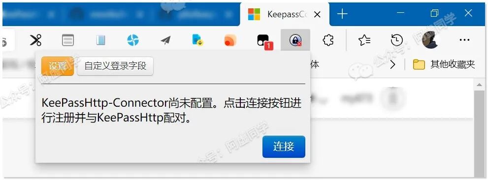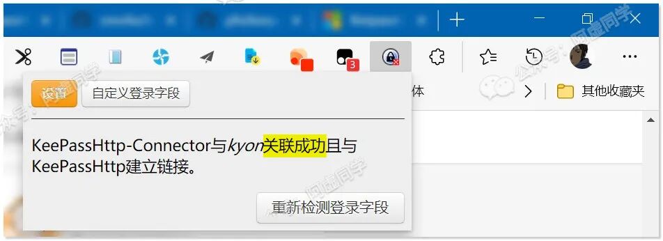 然后右上角的 KeePassConnect 的扩展图标将会闪动,点击一下,将可以将密码新建或者更新到 KeePass 中