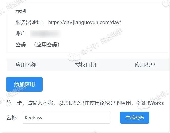然后在网页右上角账户 » 账户信息 » 安全选项中,添加一个应用并生成密码