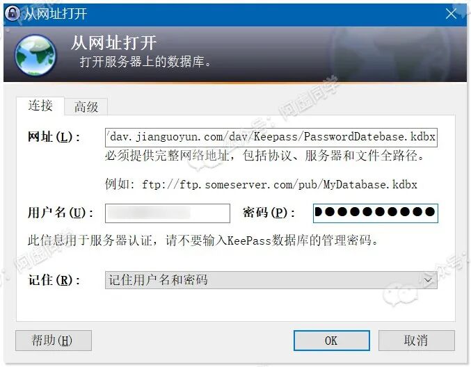 比如我的情况是:在 Keepass 文件夹下,密码库的文件名是:PasswordDatebase.kdbx,所以我的地址是:https://dav.jianguoyun.com/dav/Keepass/PasswordDatebase.kdbx