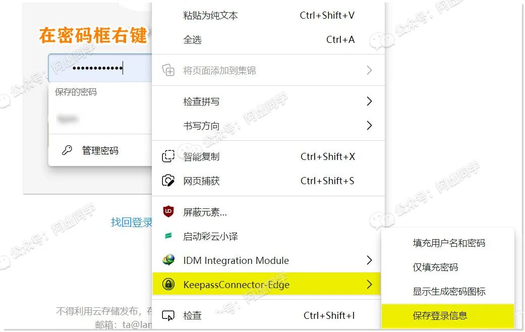 在你输入完密码后,在密码框右键,选择 KeePassConnect 的保存登录信息(Edge版的扩展作者进行了汉化,原 Chrome 版的扩展,这一步是选择save credentials)