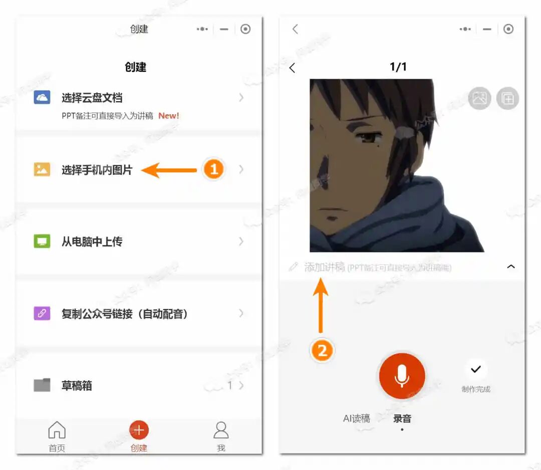 然后在之后的页面点击「添加讲稿」,每张图片下只能生成一次AI讲稿,所以你可以多添加几张照片