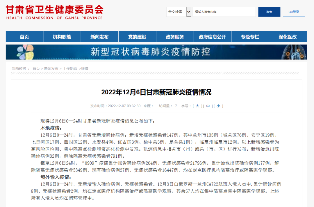 现将12月6日0—24时甘肃省新冠肺炎疫情信息公布如下:
