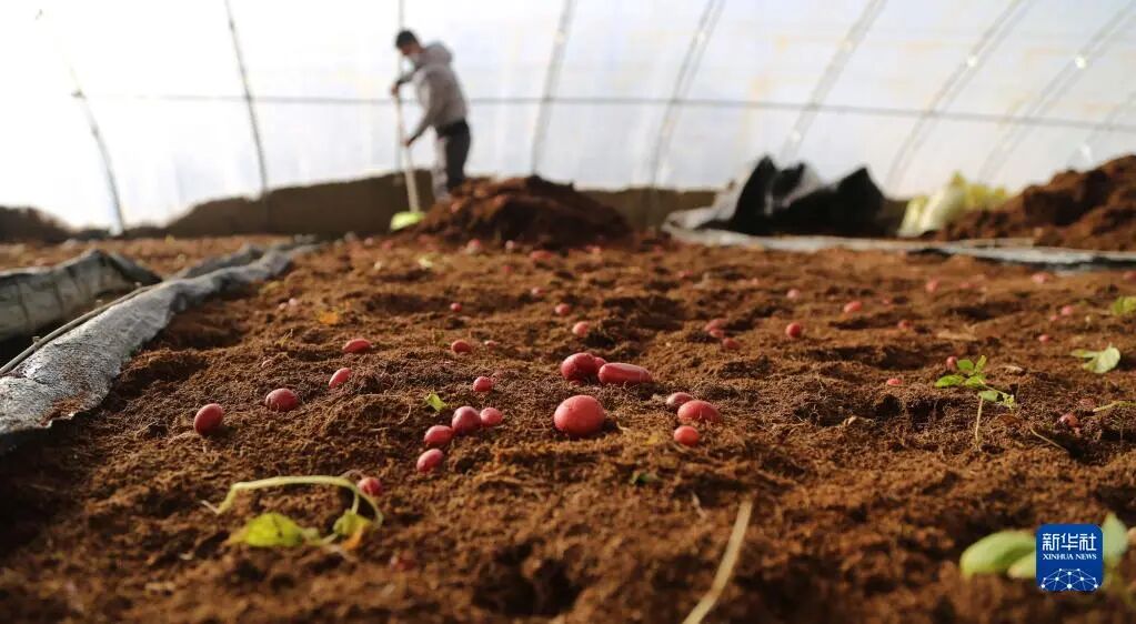 12月20日,在定西市安定区香泉镇马铃薯产业园内,工人在收获无土栽培的马铃薯原原种。新华社发(王克贤 摄)