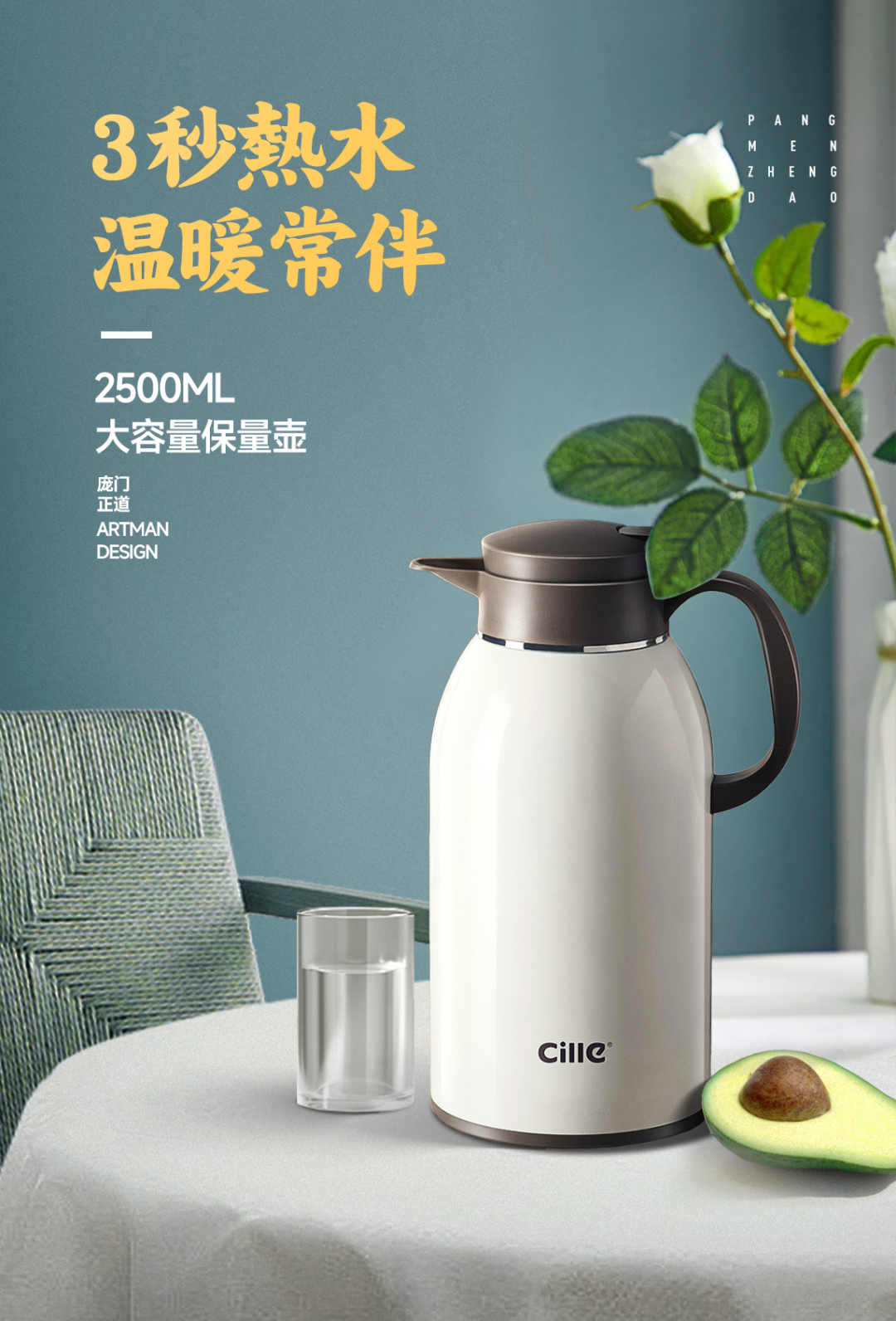 在水壶的左边加上一杯白开水,呼应产品的功能。