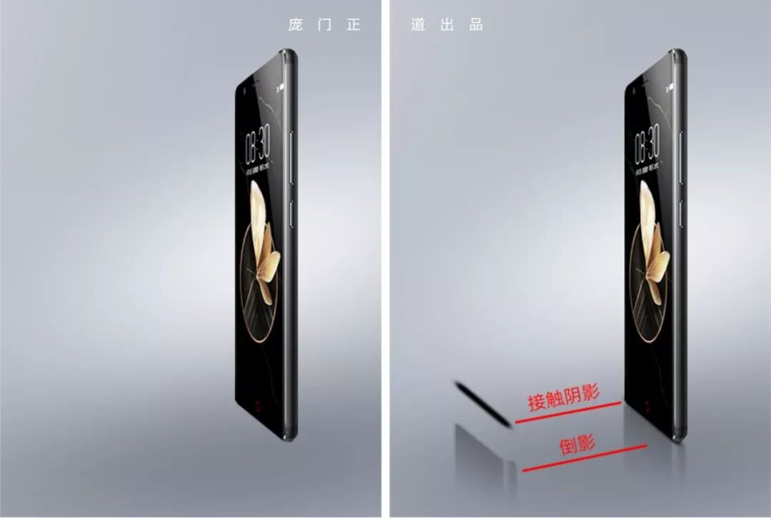第二步做接触阴影和倒影。这样手机就立起来了。