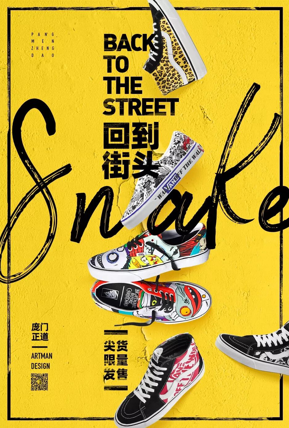 选一个涂鸦风格的英文字体打上品牌的名字,然后与鞋子做一点穿插的效果。这样整个版式在视觉上就形成了很强烈的动态变化。