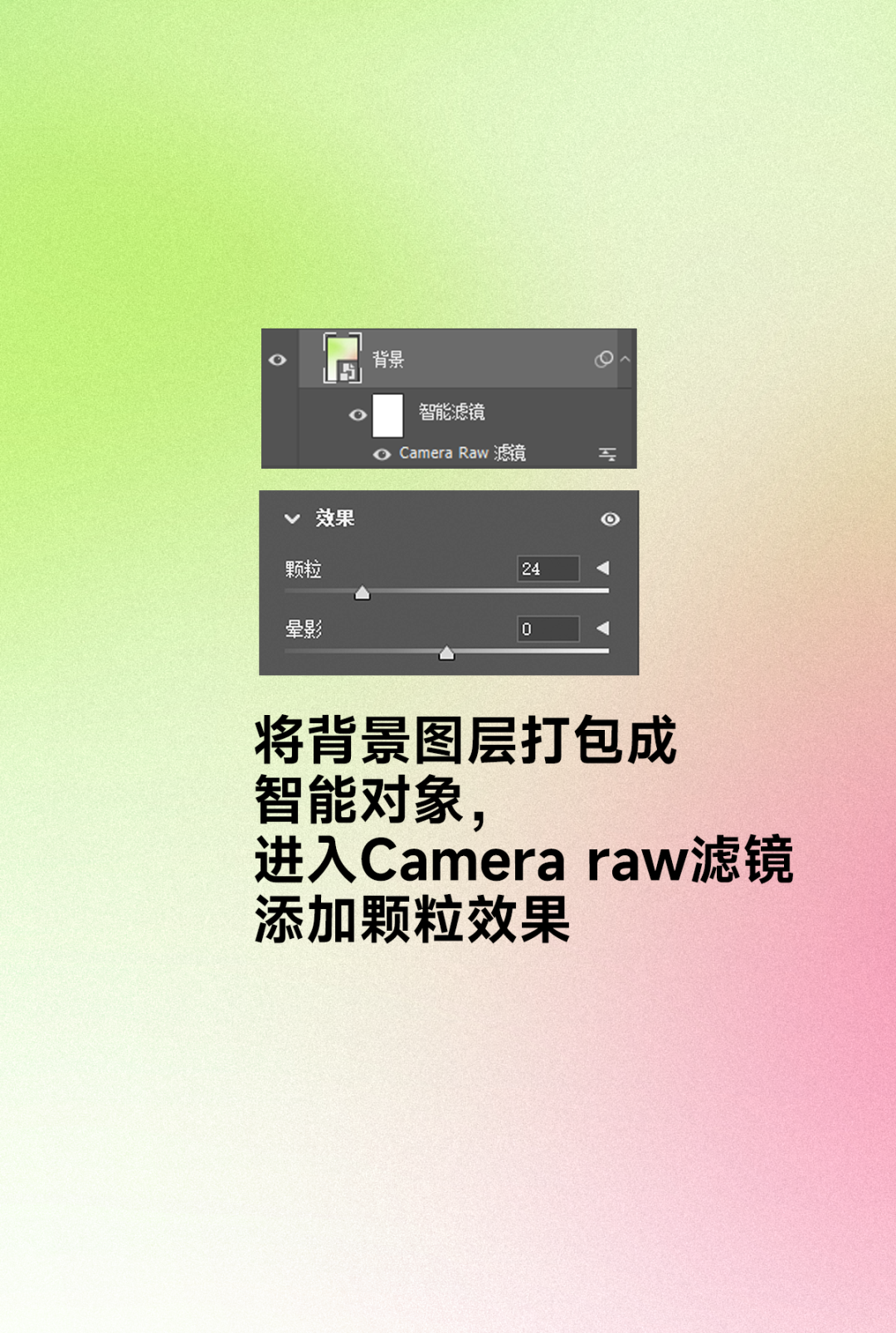 将羽化后的图层打包成智能对象,然后点击 滤镜> CameraRaw滤镜,添加颗料效果。