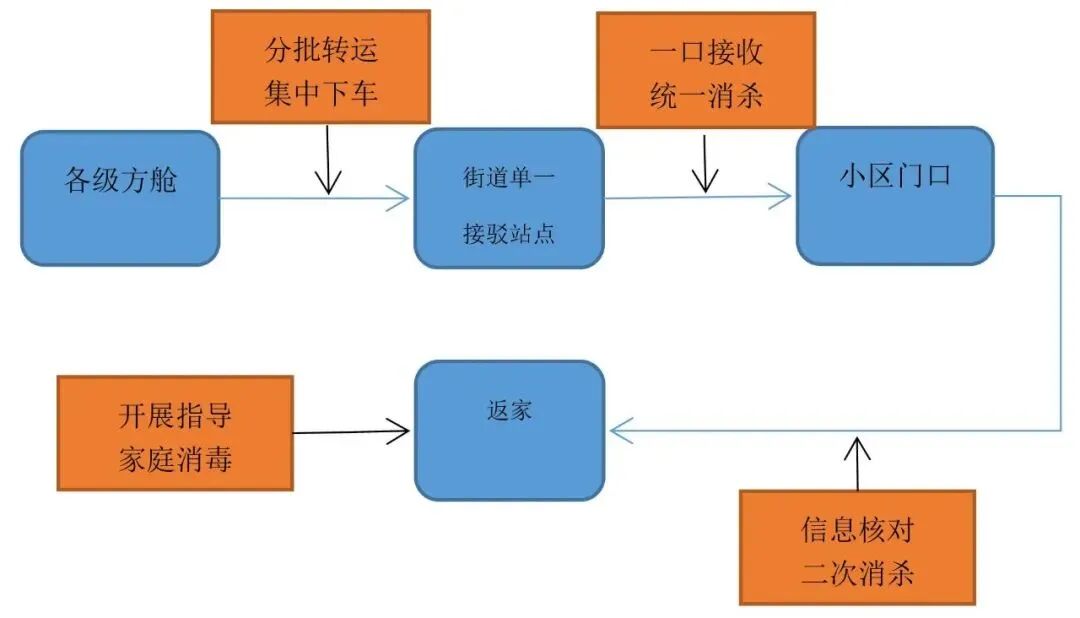 街道积极与区转运工作专班对接,设置治愈返家人员单一下车点,对返家人员的行李物品统一集中消杀,做到不漏一人。同时,在接驳回小区后,小区门岗按照提前掌握的返家人员信息,核对身份后再次开展消杀,完善闭环管理流程。