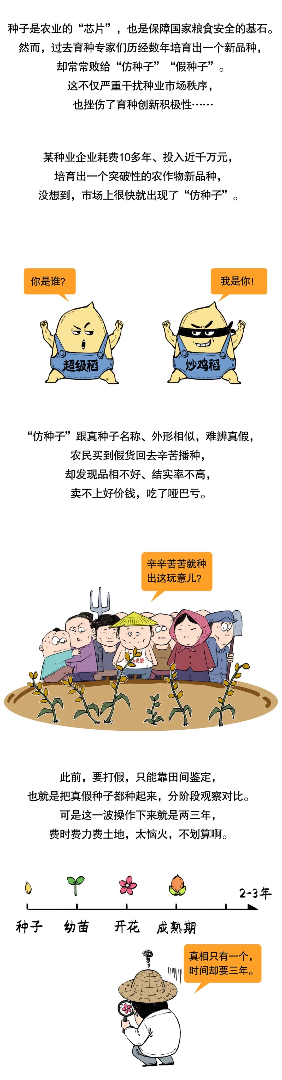 护“芯”方能强“芯”。然而,治理种业侵权违法现象谈何容易。一者,面对种子,普通人难辨真假;再者,传统的种植鉴定至少需要一个作物生长周期才能完成,使得市场监管容易滞后。难题如何破,考验的不仅是担当,更是智慧。