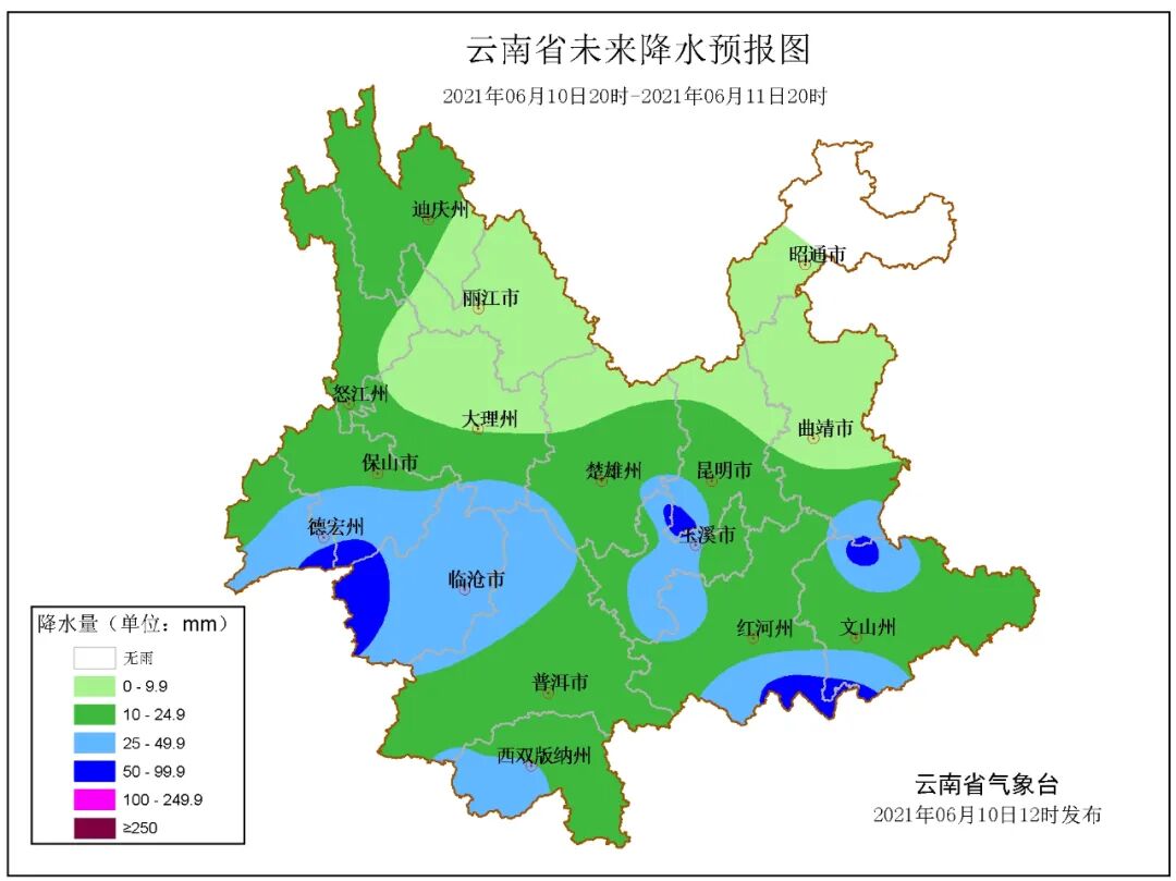 6月12日:文山南部、红河南部、普洱、西双版纳、临沧、德宏、保山、大理、丽江、怒江多云间阴有小到中雨局部大雨,其它地区多云有阵雨局部中雨。
