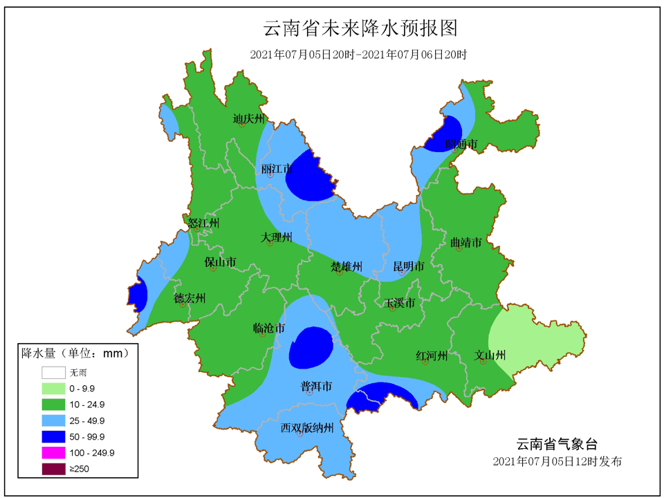 7月5日夜间至6日云南省大部有中雨,其中昭通、昆明北部、楚雄北部、丽江、怒江北部、保山北部、德宏、普洱中东部有大雨、暴雨。伴随降水,滇西北东部、滇西、滇西南、滇中、滇东南、滇东、滇东北将出现雷暴、短时强降水及局地冰雹等强对流天气,需防范局地强降雨引发的山洪、地质灾害。具体预报如下:
