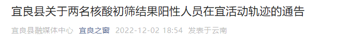 12月2日,宜良县应对新型冠状病毒感染肺炎疫情工作领导小组指挥部发布宜良县关于两名核酸初筛结果阳性人员在宜活动轨迹的通告。详情如下: