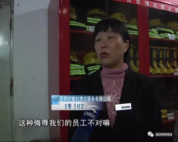 昆明好媳妇清洁服务有限公司 主管王柱定:还讲我们做的下贱活计,我们是靠劳动力吃饭,又没偷又没抢,这种侮辱我们的员工不对嘛,如果真正是我们员工错了,我们该赔就赔该怎么赔偿就赔偿,像这样在公共场所一点素质都没有。