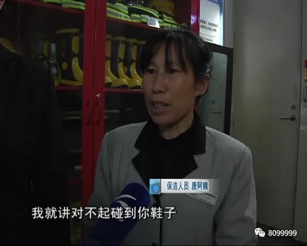 保洁人员 唐阿姨:当时在拖地她退回来踩到我拖把,我一拉就甩到她鞋子,我就讲对不起碰到你鞋子,她一口咬定要我赔她50块钱,我讲我没有钱才来做活几天,她就讲她两万块的鞋子,我说你两万块的鞋子我碰也碰到了我求求你,她要叫我跪下去求她,叫我跪下去求她我就没说话,她就一个劲骂我。