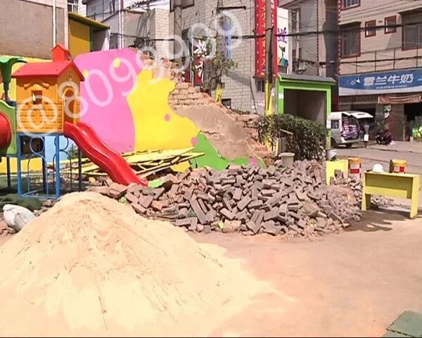 下午两点,记者来到事发幼儿园门外看到,幼儿园被推倒的围墙还没有修复,在被损围墙的两边堆放着一些施工材料。当时正值孩子们午休起床时间,由于院内一片狼藉,孩子们的活动只能在室内进行。