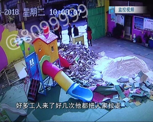 滑梯被移开之后,让人瞠目结舌的一幕发生了,一台挖机径直朝幼儿园的大门冲了过来,大门瞬间被撞倒,之后挖机调整方向,再次将大门一侧的围墙推倒。