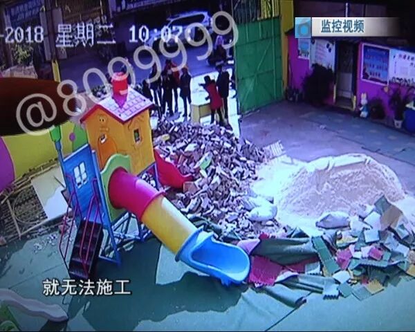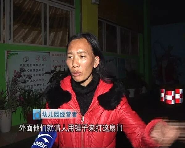 幼儿园经营者:咚咚咚,敲门,我就下来看,外面他们就请人来打这扇门。