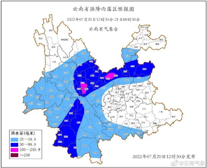 据昆明市气象局今天上午10点通报,受切变和辐合的影响,7月19日08时至7月20日08时昆明市出现中到大雨局部暴雨、大暴雨天气过程。