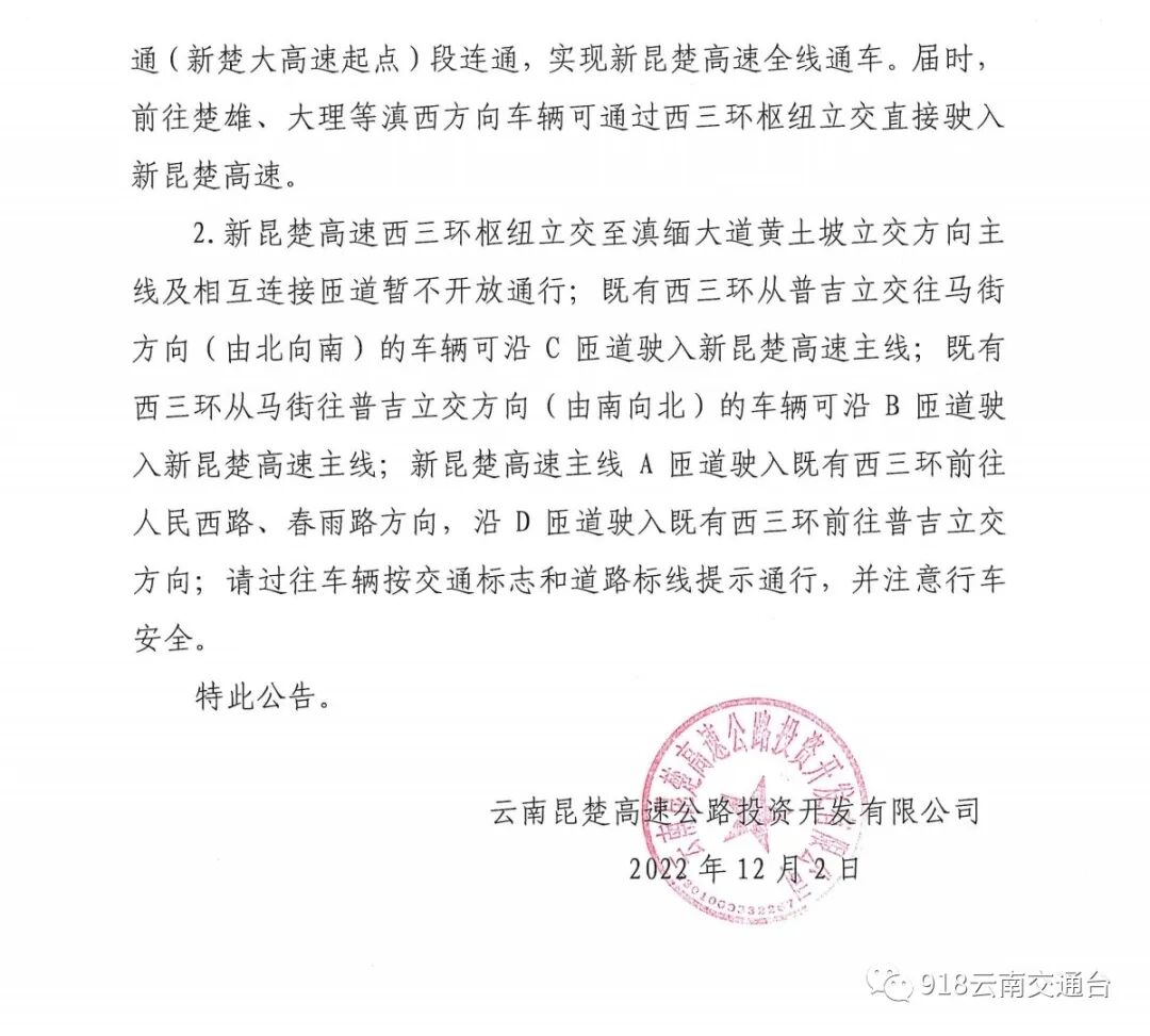 届时,前往楚雄、大理等滇西方向车辆可通过西三环枢纽立交直接驶入新昆楚高速。