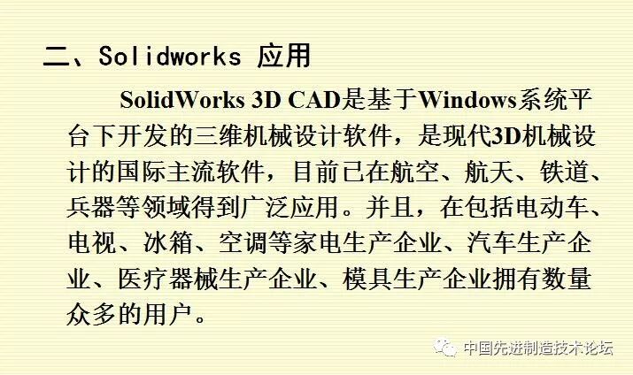 Solidworks软件功能强大,组件繁多。 Solidworks有功能强大、易学易用和技术创新三大特点,这使得SolidWorks 成为领先的、主流的三维CAD解决方案。SolidWorks 能够提供不同的设计方案、减少设计过程中的错误以及提高产品质量。SolidWorks 不仅提供如此强大的功能,而且对每个工程师和设计者来说,操作简单方便、易学易用。【需要下面这份PPT文档,后台回复“219”即可】