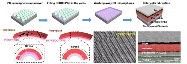 近日,中科院化学所宋延林研究员课题组和南昌大学陈义旺教授课题组的研究人员创造性地通过纳米组装-印刷方式,制备出蜂巢状的微纳米支架,并作为力学缓冲层和光学谐振腔,大幅提高了柔性钙钛矿太阳能电池的光电转换效率和力学稳定性。