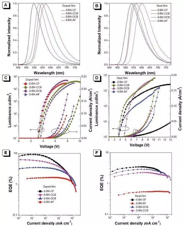 E-F:外部量子效率(EQE)相对于CPOLEDs的电流密度图的电致发光光谱。