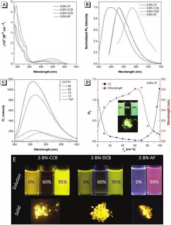 A:室温下在甲苯中的S-BN-CF,S-BN-CCB,S-BN-DCB和S-BN-AF的吸收光谱;