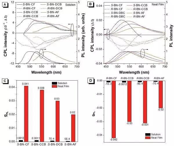 C-D: S-BN和R-BN在甲苯溶液和纯膜状态下的gPL值 (gPL, 对光致圆偏振发光的非对称性程度定量化的值)。