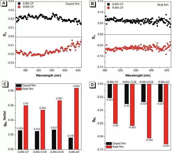 C-D:在掺杂膜和纯膜状态下,S-BN和R-BN在最大发射波长下计算的gEL的示意图。