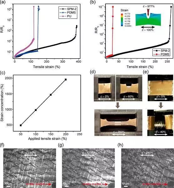 (f-h)原位SEM图像以揭示SPM-2可拉伸薄膜金电极的机理;