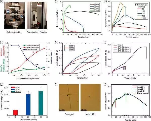 (i)原始和自我修复的SPM-2样品经过三个不同愈合时间(6-24小时,然后在室温下48小时)的应力 - 应变曲线;