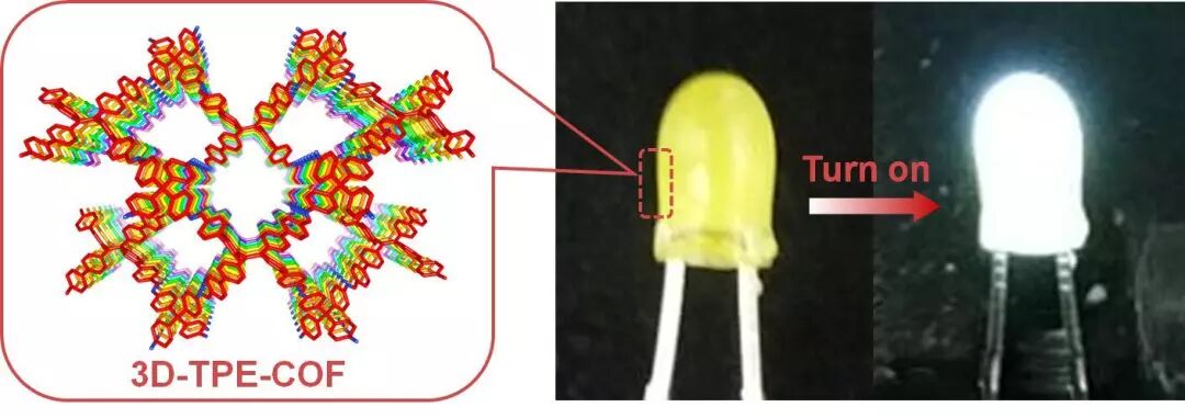 研究表明,3D-TPE-COF具有较高的热稳定性及化学稳定性,而且在450 nm蓝光激发下可发出黄色荧光。进一步,他们将该COF材料均匀涂覆到日常使用的450 nm峰值波长的蓝色发光二极管表面,点亮后器件会发出白光,成功地制备了第一个基于COF的白色发光二极管。值得注意的是,该器件在电流驱动下连续工作1200小时后,亮度未见任何衰减,表明其具有较高的稳定性和实用价值。此研究为后续三维COF材料的应用拓展奠定了重要的实验基础。
