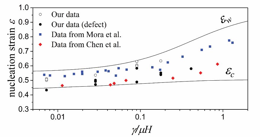 褶皱失稳的应变区间可以被实验测量。图5中汇总了文中新采集的数据与之前文献中报道的数据。正如理论所预测,软材料褶皱的失稳是对缺陷敏感的,并且总发生在理论预测的应变范围内。