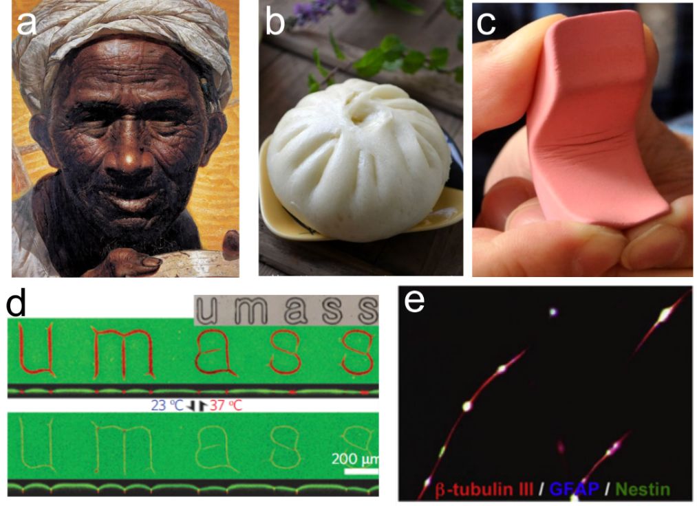 图1. 褶皱在软材料表面十分寻常亦有重要的应用前景。a. 皮肤上的皱纹(图为罗中立油画《父亲》)。b. 包子上的褶痕。c. 挤橡皮时的细纹。d. 利用褶皱动态呈现生物分子[1]。e. 利用褶皱诱导神经突的生长[2]。