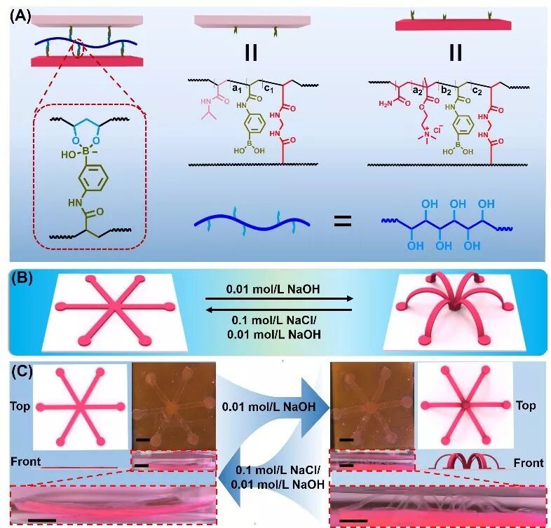 智能高分子水凝胶(smart hydrogel)是指在外界温度、离子浓度和pH等刺激下能发生体积、形状或颜色等变化的一类智能材料。其中,智能变形水凝胶由于在外界刺激下可将各种外部能量转化为机械能从而使自身发生可逆形变,在柔性驱动器、柔性传感器、软质机器人等诸多新兴领域具有广阔的应用前景。经过多年的发展,智能变形水凝胶已经摆脱单一的刺激响应模式以及简单的溶胀收缩行为,发展出更为复杂的二维、三维复杂形变。然而,传统的智能变形水凝胶通常在凝胶的制备过程中就被赋予各向异性,其形变程度和形变方向等通常无法再改变。