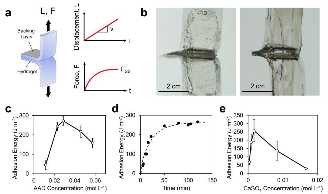 研究人员用180度剥离的方法来测试共价拓扑粘接的粘接能(图3a)。在实验中,他们发现当粘接能低于200 J/m2的时候,裂纹在界面中扩展,并且水凝胶的剥离表面很平滑;然而当粘接能高于200 J/m2的时候,裂纹在水凝胶中扩展,并且水凝胶剥离的表面非常粗糙(图3b)。当AAD的浓度在0.0287 M时,粘接能达到最大,约为270 J/m2(图3c)。该值已经很接近于PAAM的断裂能。研究人员还发现粘接能在前20分钟内会随着时间迅速增长,并且在两小时左右达到平衡(图3d)。相比于共价拓扑粘接,高密度离子键形成的海藻酸钠网络虽然起到的是非共价拓扑粘接,但是同样可以达到很高的粘接能,最高可达260 J/m2(图3e)。