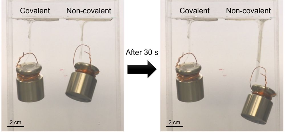 最后,研究人员展示了共价拓扑粘接在生理盐水中的稳定性,从而提供了潜在的医疗应用前景。两块分别用共价与非共价拓扑粘接的水凝胶均挂上相同的重量,同时浸没于生理盐水中,30秒后,共价拓扑粘接的水凝胶保持稳定,而非共价粘接的水凝胶却已经非常迅速的脱粘了(图5)。
